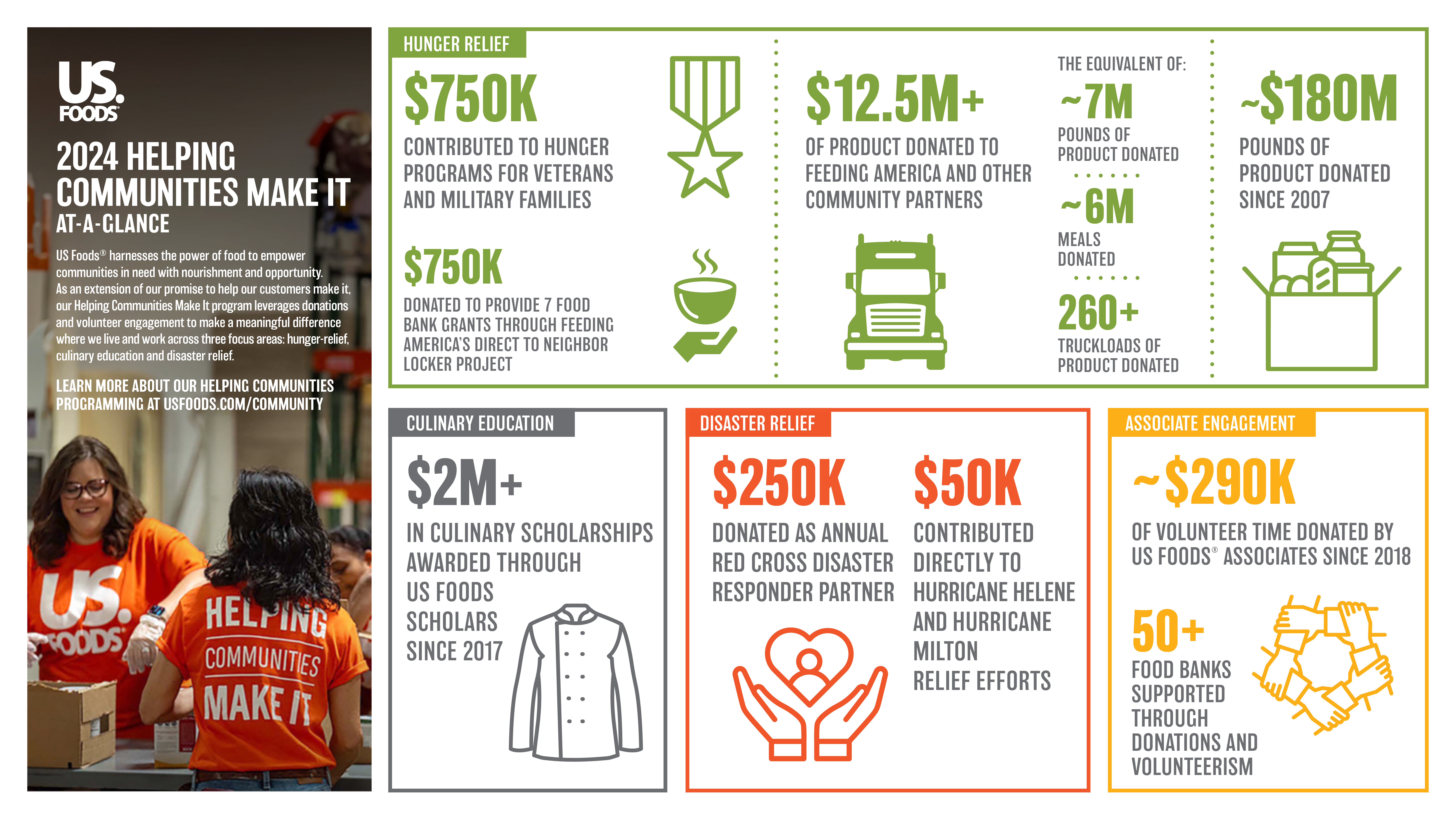 US Foods Holding Corp. (NYSE: USFD), one of America’s largest foodservice distributors, announced today that the company and its associates donated nearly $14.5 million in cash, product and volunteer time to support hunger relief, culinary education and disaster relief efforts throughout 2024. The total contribution included nearly 7 million pounds of food and supplies donations, the equivalent of approximately 6 million meals or more than 260 truckloads of product.